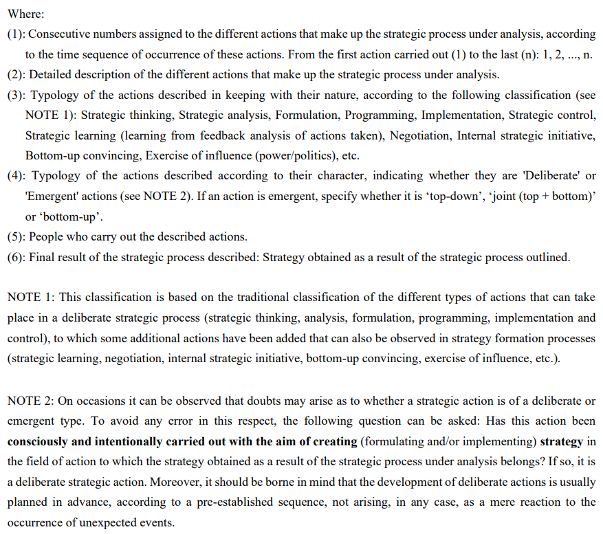 – A table in which the different actions that make up the strategic process under analysis, as well as the strategy obtained as a result of this process, can be described in detail (see Table 1).