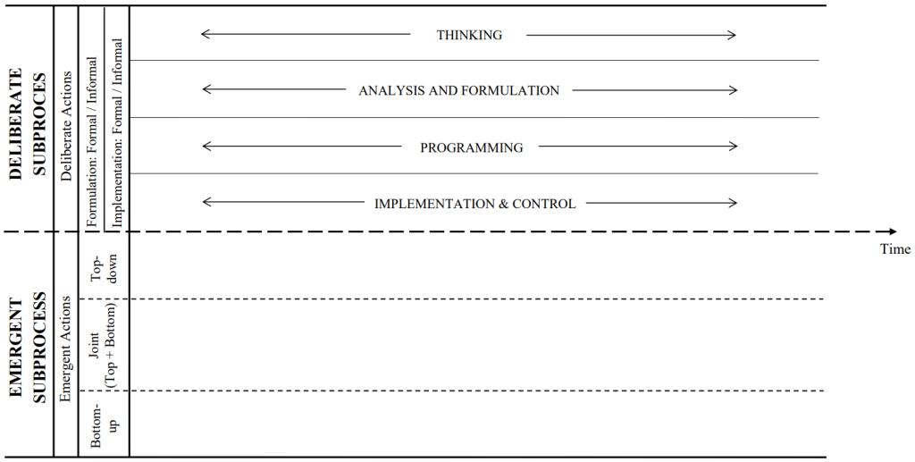 This figure is composed of two axes: the horizontal axis, where the variable ‘time’ is reflected, and the vertical axis, which incorporates the two types of strategic subprocesses existing in the ‘Theoretical Model’ (Deliberate Subprocess and Emergent Subprocess).