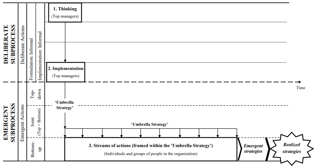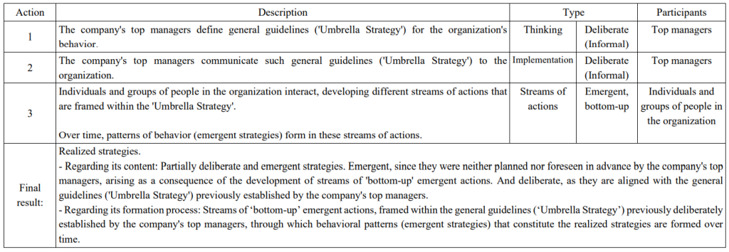 The following table and figure respectively describe and represent the strategic process enacted by the ‘Umbrella Strategy’ model, assuming that strategies emerge from this process as patterns of behavior in streams of actions carried out by individuals and groups of people in the organization.