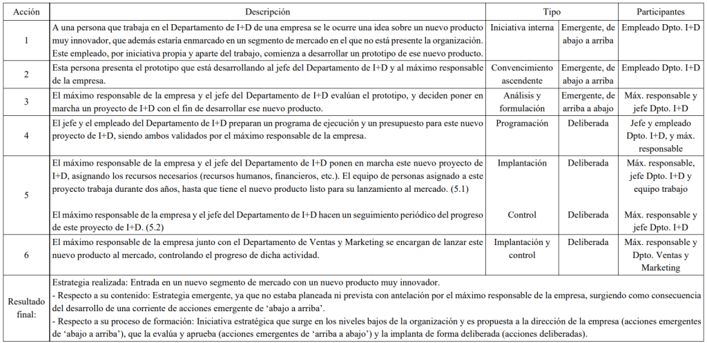 Como ejemplo se ha tomado un proceso estratégico que comienza con el desarrollo de una iniciativa interna por parte de una persona situada en los niveles bajos de la organización. Esta persona informa a los directivos sobre su iniciativa, tratando de convencerles de su idoneidad. Los directivos evalúan y aceptan esta iniciativa, planificando (programando) su implantación. Por último, esta iniciativa estratégica se implanta tal como se ha planificado.