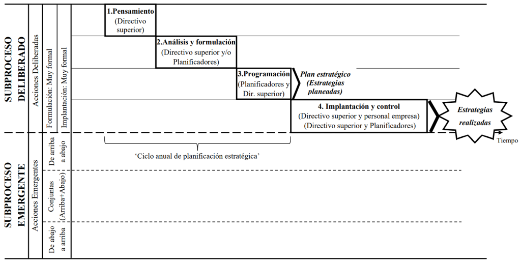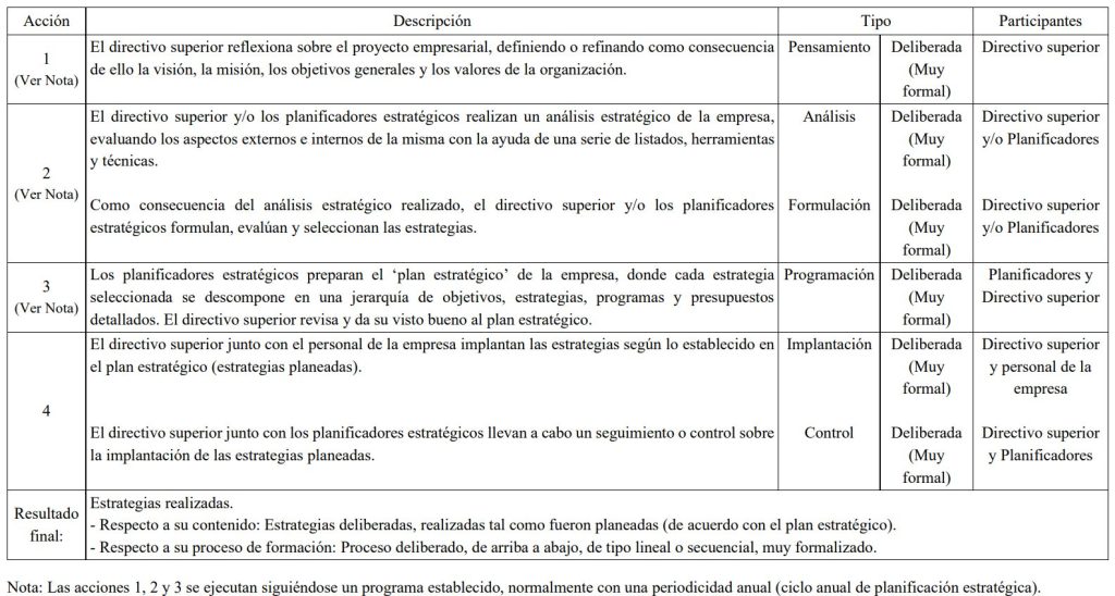 Las estrategias provienen de un proceso controlado y consciente de planificación formal, dividido en etapas claras, cada una de ellas sustentada por una serie de listados, herramientas y técnicas. Las etapas de este proceso son: fijación de objetivos, análisis externo e interno, formulación, evaluación y selección de estrategias, y planificación (preparación del plan estratégico: descomposición detallada de cada estrategia seleccionada en una jerarquía de objetivos, estrategias, programas y presupuestos). Estas etapas se ejecutan siguiendo un programa establecido, normalmente con una periodicidad anual (ciclo anual de planificación estratégica). Por último, se procede a implantar las estrategias seleccionadas, de acuerdo con lo establecido en el plan estratégico, y a realizar un seguimiento o control de dicha implantación.