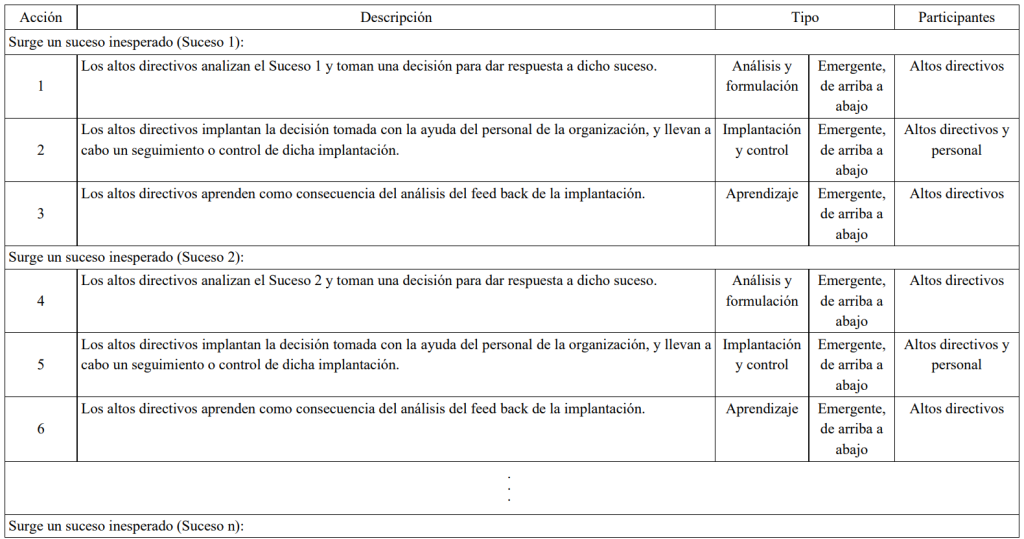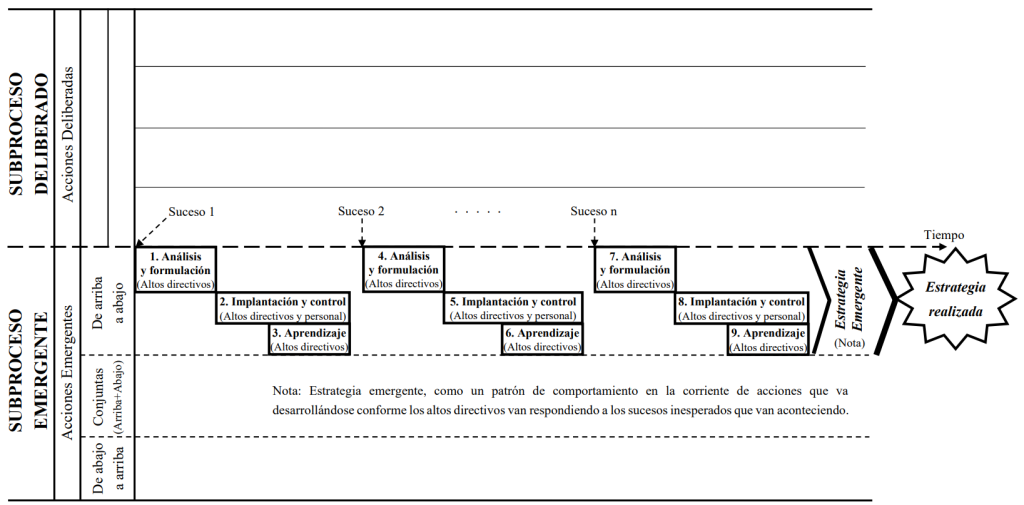 En la tabla y la figura siguientes se describe y se representa el proceso estratégico emergente según Mintzberg cuando los protagonistas son los altos directivos (proceso emergente de ‘arriba a abajo’). En este caso el proceso estratégico está constituido por una corriente de acciones que son llevadas a cabo de forma incremental e iterativa conforme los altos directivos van respondiendo a los sucesos inesperados que van aconteciendo, a partir de las cuales van aprendiendo como consecuencia de la confrontación entre el pensamiento y la acción (análisis y formulación → acción → feed back (control) → aprendizaje (análisis del feed back)), de forma que con el paso del tiempo se va convergiendo en un patrón de comportamiento que constituye la estrategia (estrategia emergente).