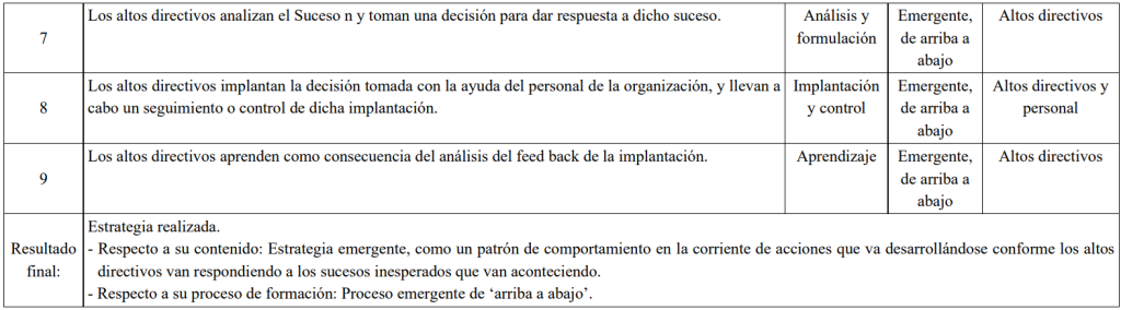 Tabla: Descripción del proceso estratégico emergente de ‘arriba a abajo’ según Mintzberg