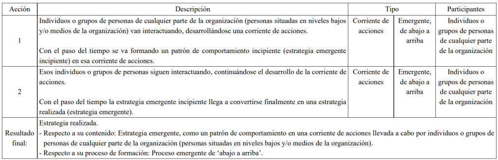 Tabla: Descripción del proceso estratégico emergente de ‘abajo a arriba’ según Mintzberg
