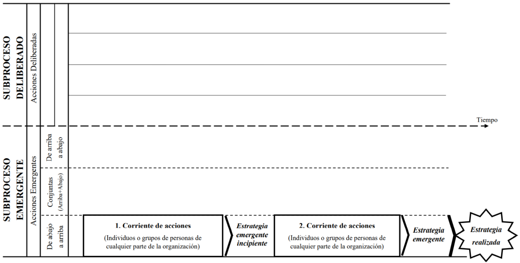 Teniendo en cuenta lo expuesto en el caso de estudio anterior (Entrada 18), en la siguiente tabla y figura se describe y se representa el proceso estratégico emergente según Mintzberg cuando los protagonistas son participantes individuales o grupos de personas de cualquier parte de la organización (proceso emergente de ‘abajo a arriba’), que van interactuando, de modo que con el paso del tiempo se va formando un patrón de comportamiento incipiente en esa corriente de acciones (estrategia emergente incipiente), que llega a convertirse finalmente en una estrategia realizada (estrategia emergente) sin que para ello haya sido necesaria su incorporación al proceso estratégico deliberado por parte de la alta dirección.