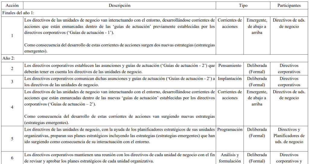 En todo momento, y en paralelo al proceso anterior, los directivos de las unidades de negocio van interactuando con el entorno, desarrollándose corrientes de acciones enmarcadas dentro de las ‘guías de actuación’ previamente establecidas, por las que surgen algunas estrategias emergentes. En la siguiente tabla y figura se describen y se representan las corrientes de acciones desarrolladas por los directivos de las unidades de negocio a finales del año 1, por las que surgen varias estrategias emergentes (por ejemplo, dos estrategias emergentes) que no son incorporadas al plan estratégico del año 1 al haber aparecido posteriormente a la preparación de dicho plan.