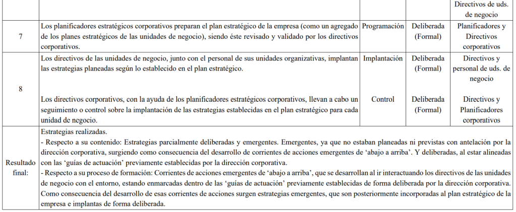 Por tanto, el contenido del plan estratégico es determinado fundamentalmente por los directivos de las unidades de negocio, a los que se ha dado una gran autonomía con el fin de aumentar la velocidad de respuesta a las condiciones cambiantes del entorno. Y los directivos corporativos, por su parte, se centran en establecer el contexto en el que los directivos de las unidades de negocio crearán sus estrategias, negociando los objetivos de desempeño y cuestionando las estrategias propuestas por estos últimos para lograr dichos objetivos.