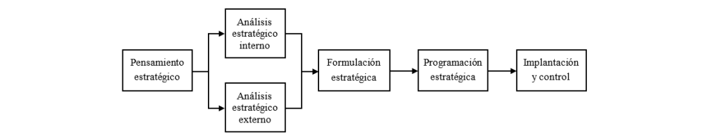 - Pensamiento estratégico –> Análisis estratégico –> Formulación estratégica –> Programación –> Implantación y control.